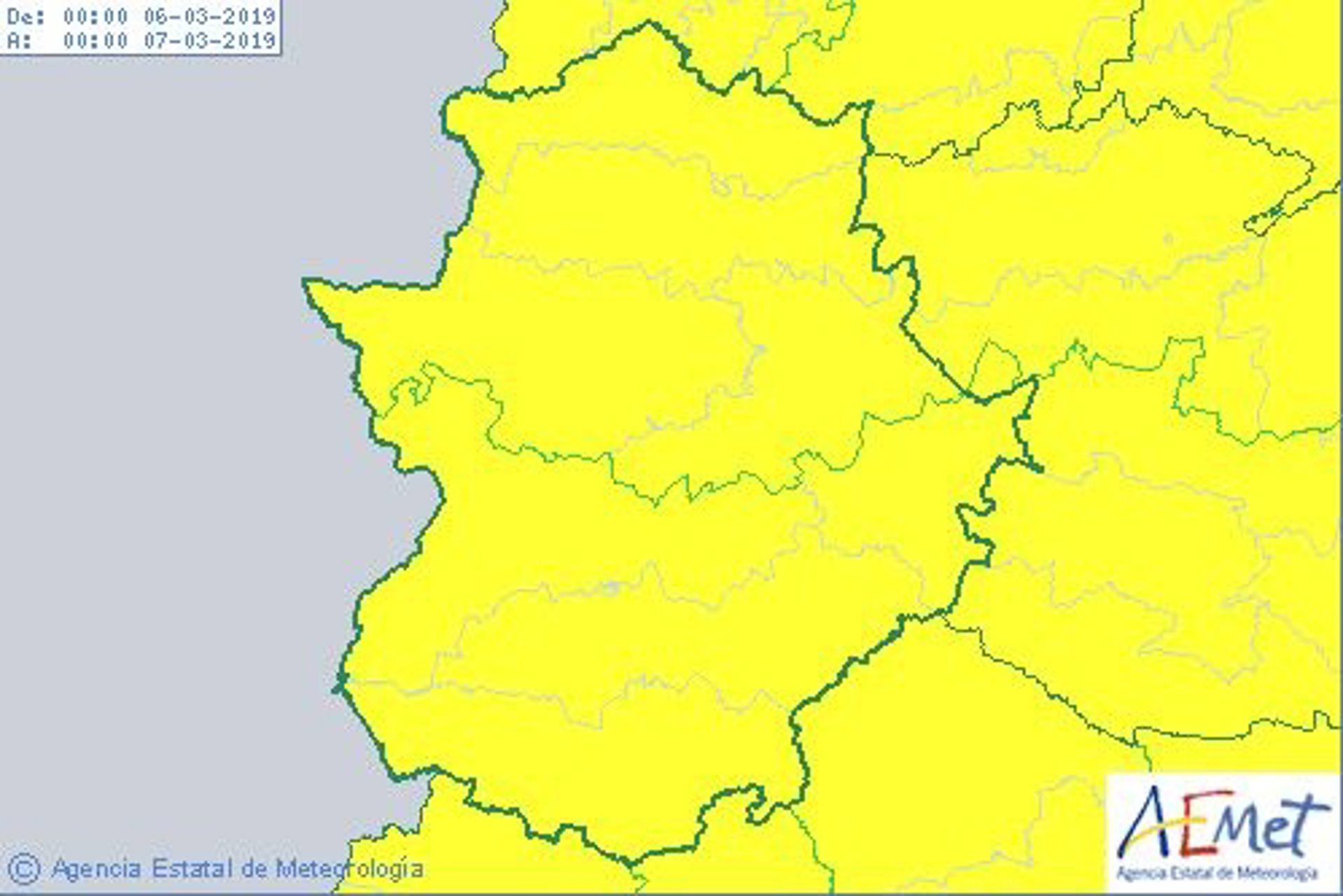 Además, la lluvia pondrá en alerta también este miércoles al norte de la provincia de Cáceres, que permanecerá activo entre las 7,00 y las 16,00 horas, con una precipitación acumulada de 15 milímetros en una hora.