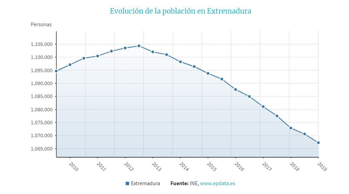 La población de Extremadura ha descendido en 3.181 personas durante la primera mitad del año, un 0,3 por ciento, y se ha situado en 1.067.272 habitantes, según se desprende de los datos provisionales de las cifras de población correspondientes a 1 de julio de 2018, publicadas este 13 de diciembre por el Instituto Nacional de Estadística (INE).