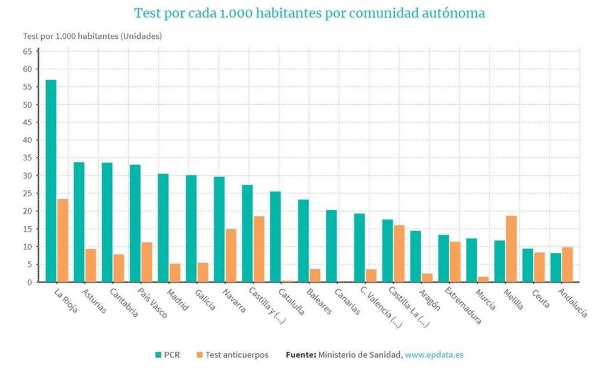 Por comunidades autónomas, según ha informado el Ministerio de Sanidad, en Andalucía se están haciendo 17,95 test por cada 1.000 habitantes; en Aragón 16,85; en Asturias 43,07; en Baleares 26,88; en Canarias 20,29; en Cantabria 41,40; en Castilla y León 45,86; en Castilla-La Mancha 33,61; en Cataluña 25,89; en la Comunitat Valenciana 22,91; en Extremadura 24,63; en Galicia 35,51; en Madrid 35,69; en Murcia 13,80; en Navarra 44,56; en el País Vasco 44,21; en La Rioja 80,30; en Ceuta 17,72; y en Melilla 30,37.