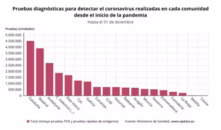 A su vez, en España se han realizado un total de 22.660.315 pruebas diagnósticas desde que comenzó la epidemia por Covid-19 hasta el 31 de diciembre, según las comunidades autónomas han notificado al Ministerio de Sanidad que, además, informa de que de éstas, 19.115.259 son PCR y 3.545.056 son test de antígenos.
