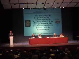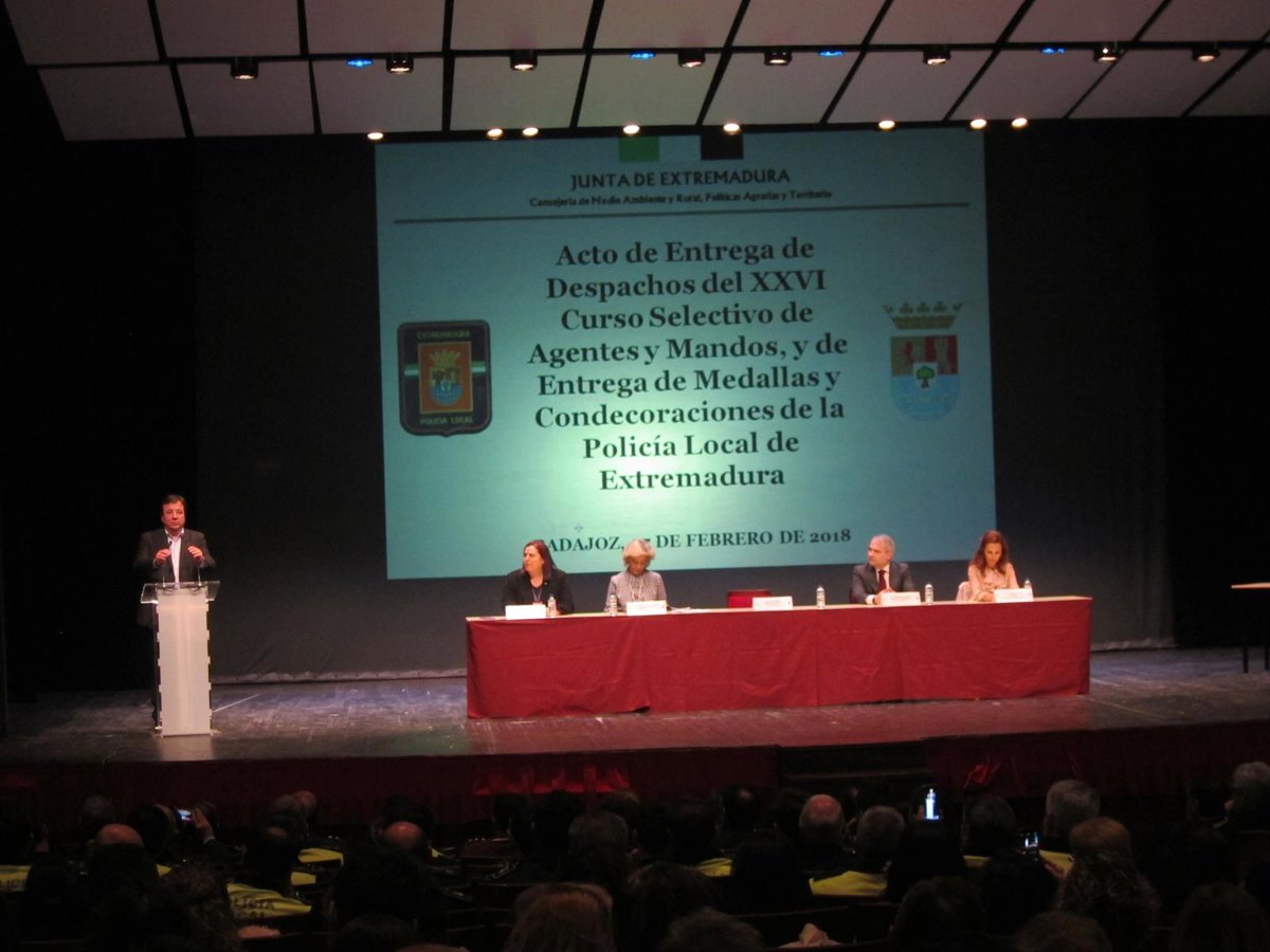 Estos reconocimientos han sido entregados durante la clausura el XXIV Curso Selectivo de Agentes y Auxiliares de la Policía Local de Extremadura, desarrollada en el Teatro López de Ayala de Badajoz con la presencia del presidente de la Junta de Extremadura, Guillermo Fernández Vara, la consejera de Medio Ambiente y Rural, Políticas Agrarias y Territorio, Begoña García Bernal, la delegada del Gobierno en la región, Cristina Herrera, y el alcalde de la ciudad, Francisco Javier Fragoso.