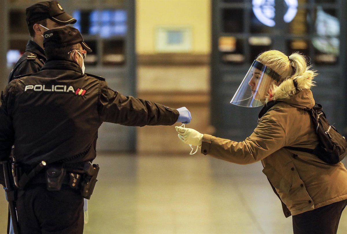 Un policía nacional entrega una mascarilla a una mujer en el vestíbulo de la estación del Norte de Valencia el día en el que se reactiva la actividad laboral no esencial en las empresas cuyos empleados no puedan teletrabajar. 14 de abril de 2020. - Rober Solsona - Europa Press