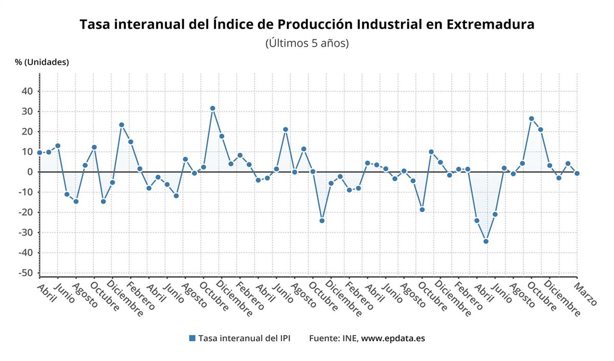La producción industrial descendió en marzo en Extremadura un -0,7% por ciento, la mayor caída por comunidades tras la de Baleares (-1,1%%), según ha informado este viernes el Instituto Nacional de Estadística (INE).