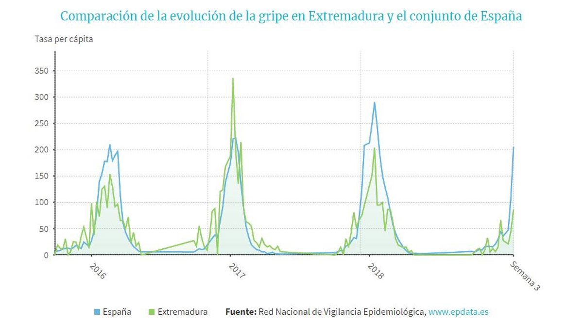 La comunidad autónoma de Extremadura es la única del país en la que la incidencia de la gripe permanece todavía por debajo del nivel epidémico, que ha sido superado ya en el resto del territorio español, aunque se prevé que lo alcance "en breve".