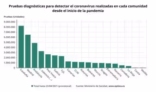 A su vez, a nivel nacional, las comunidades autónomas han notificado al Ministerio de Sanidad que, hasta el 22 de abril, han llevado a cabo un total de 39.533.769 pruebas diagnósticas, de las cuales 29.675.676 han sido PCR y 9.858.093 test de antígenos.