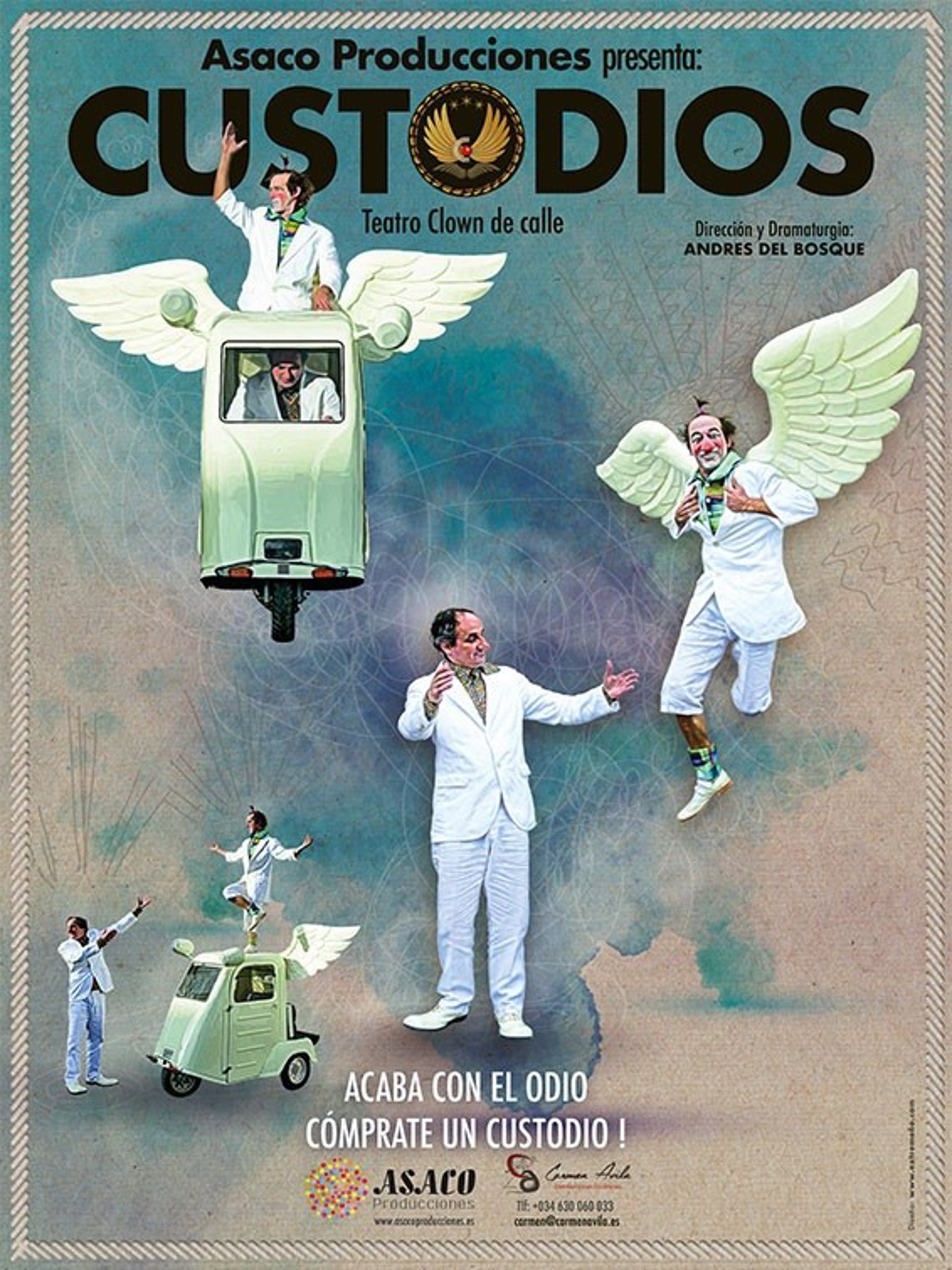 El show comienza con un pequeño pasacalles itinerante interactivo, continuando con varios sketch que muestran las virtudes de un ángel-payaso de la guarda en prácticas, con el fin de que, a través de una subasta ofertorio, alguno de los presentes compre este ángel custodio. El espectáculo, dirigido al público familiar, incluye pantomima, música y mucha risa, con el lema "¡Acaba con el odio, cómprate un custodio!", informa en nota de prensa 'Asaco Producciones'.