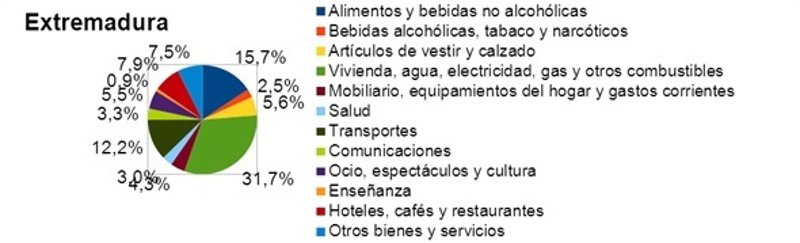 Analizando la distribución porcentual por grupos de gasto, los extremeños dedican más gasto que la media a alimentación (el 15,71% del total), bebidas alcohólicas y tabaco (2,46%), vestido y calzado (5,55%), mobiliario (4,32%), transporte (12,21%) y comunicaciones (3,33%), pero quedan por debajo en vivienda (31,68%), salud (3,03%), ocio (5,49%), enseñanza (0,85%), hostelería (7,92%) y otros bienes y servicios (7,46%).