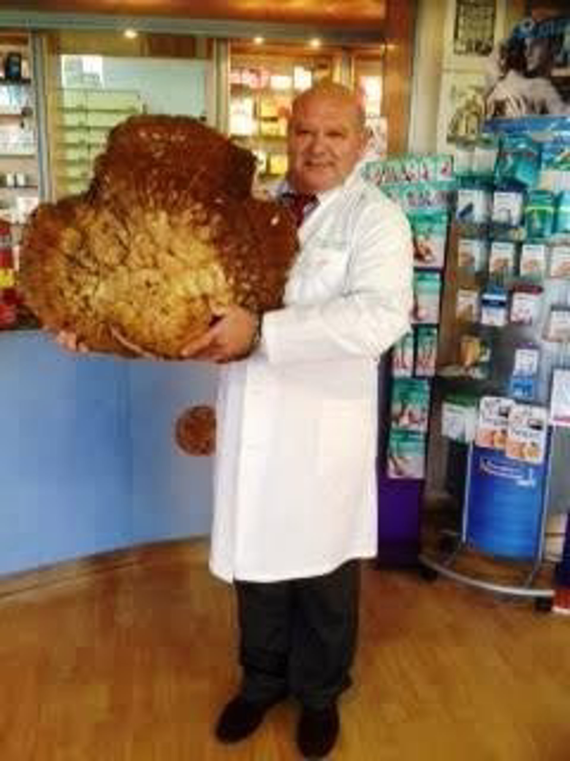 El cacereño Luis Conde ha encontrado una seta de más de doce kilos y 60 centímetros de diámetro en su sombrero. Se trata de la especie Inonotus dryadeus, una imponente seta que crece en forma de ménsula de color crema en la base del tronco de encinas y robles viejos.