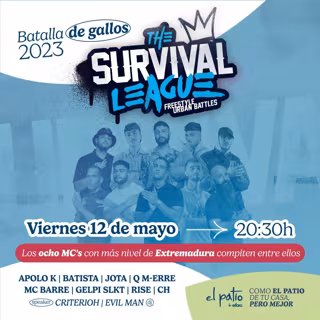 Por su parte, The Survival League contará con los ocho MC 's (raperos) "más activos y con más nivel de Extremadura", que compiten entre ellos de manera continuada a lo largo de la temporada, en una competición en la que la regularidad y el talento son claves para alzarse con la victoria. De esta forma, los raperos Apolo k, Rise, Mc Barre, Batista, Gelpi, Jota Q, M-Erre y CH, luchan cada jornada por convertirse en el campeón de la liga profesional y referente del freestyle de la región.