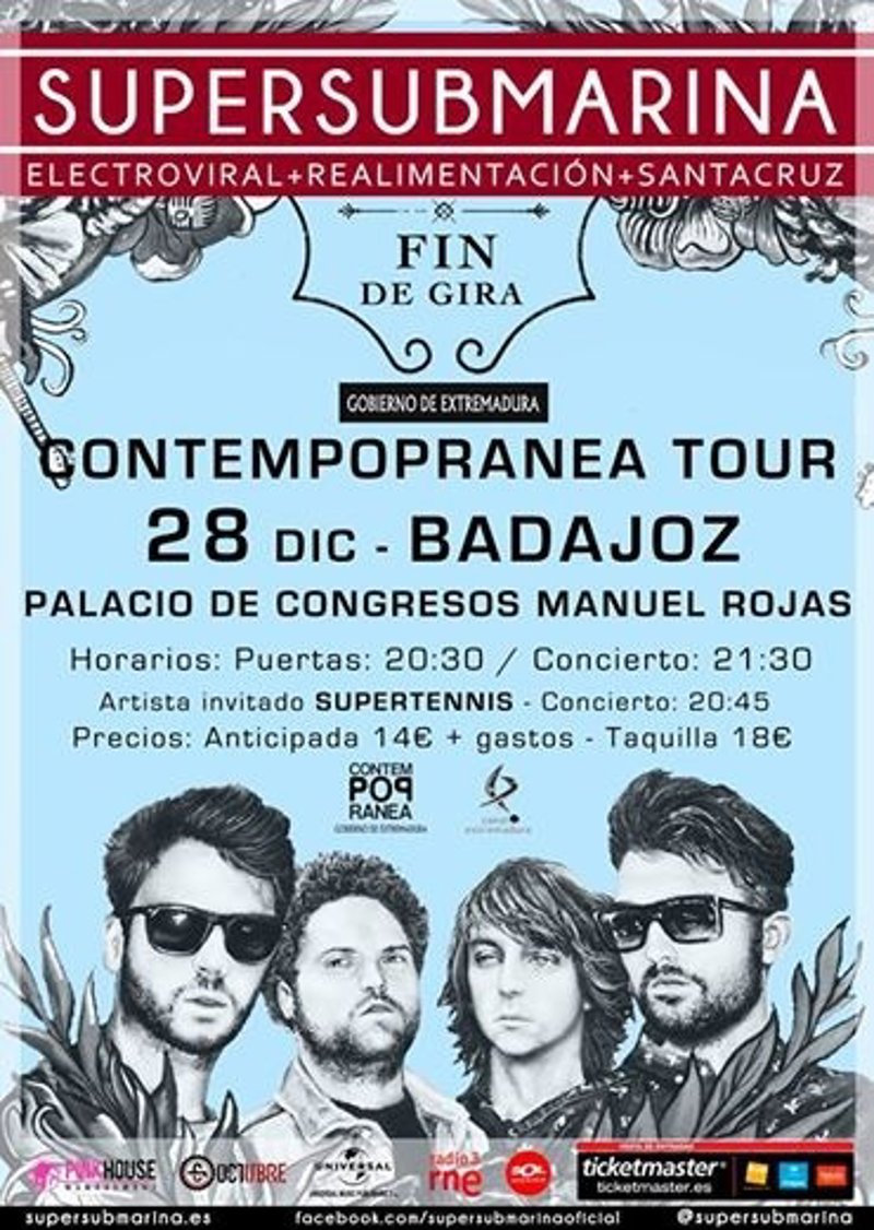 El Festival Contempopránea ofrecerá el próximo sábado, 28 de diciembre en Badajoz, un "aperitivo" de su próxima edición en un evento en el que participarán los grupos 'Supersubmarina', una de las formaciones de mayor éxito en España, que hará un repaso a su trayectoria musical, y 'Supertennis', una de las formaciones extremeñas "más pujantes del momento".