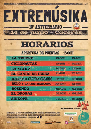 El festival Extremúsika, que se celebra el próximo sábado, día 14, en el recinto hípico de Cáceres, comenzará a las 19,00 horas con la actuación del primer grupo, La Trueke, y concluirá con el concierto de Sínkope, que se subirá al escenario a eso de las 4,25 horas para culminar unas diez horas de música ininterrumpida, en lo que será la vuelta del certamen rockero a la capital cacereña donde festejará su décimo aniversario.