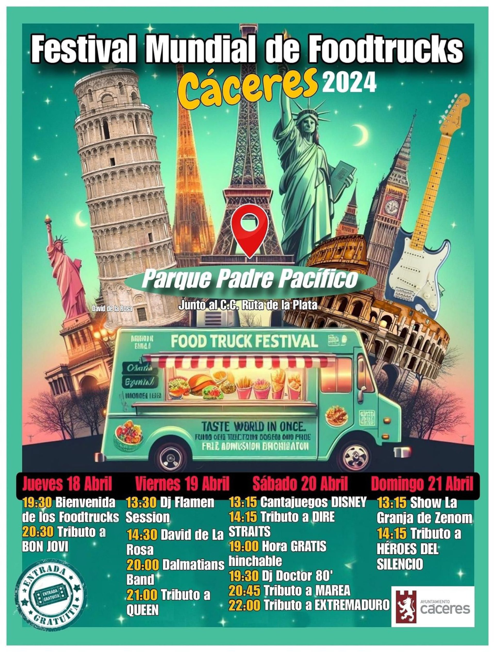 El Festival Mundial de Foodtrucks llega a Cáceres por tercer año consecutivo con propuetas gastronómicas de diferentes países que se podrán degustar desde este jueves 18 y hasta el domingo 21 de abril en el Parque Padre Pacífico, donde se instalarán 14 foodtrucks y se llevarán a cabo actividades para todos los públicos, como conciertos y talleres.