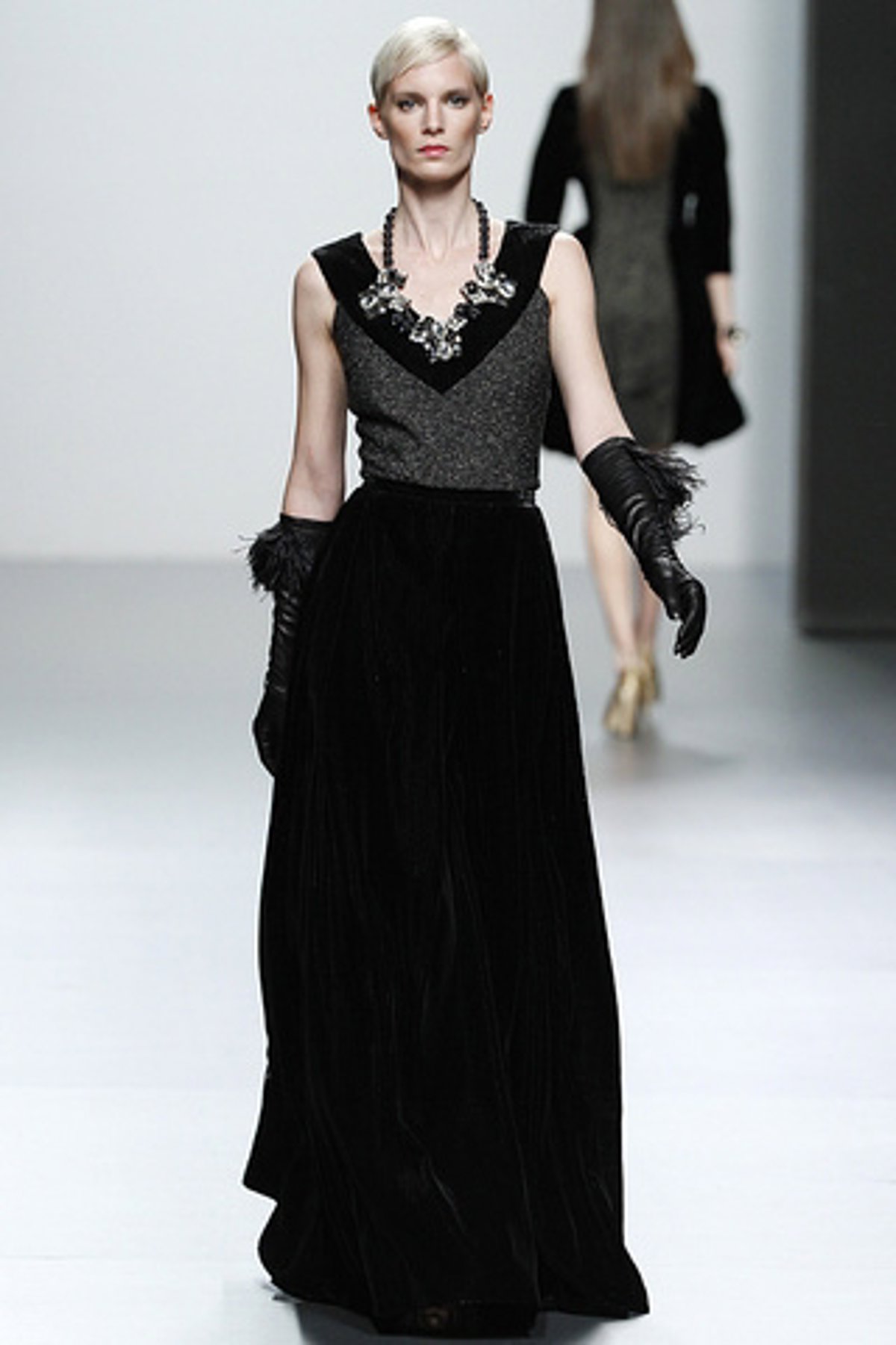 Cinturas marcadas, amplias faldas y el corte de la sastrería tradicional muy propio del diseñador madrileño, que "confía en el negro y toda una amplia gama de grises para protagonizar su nueva colección".