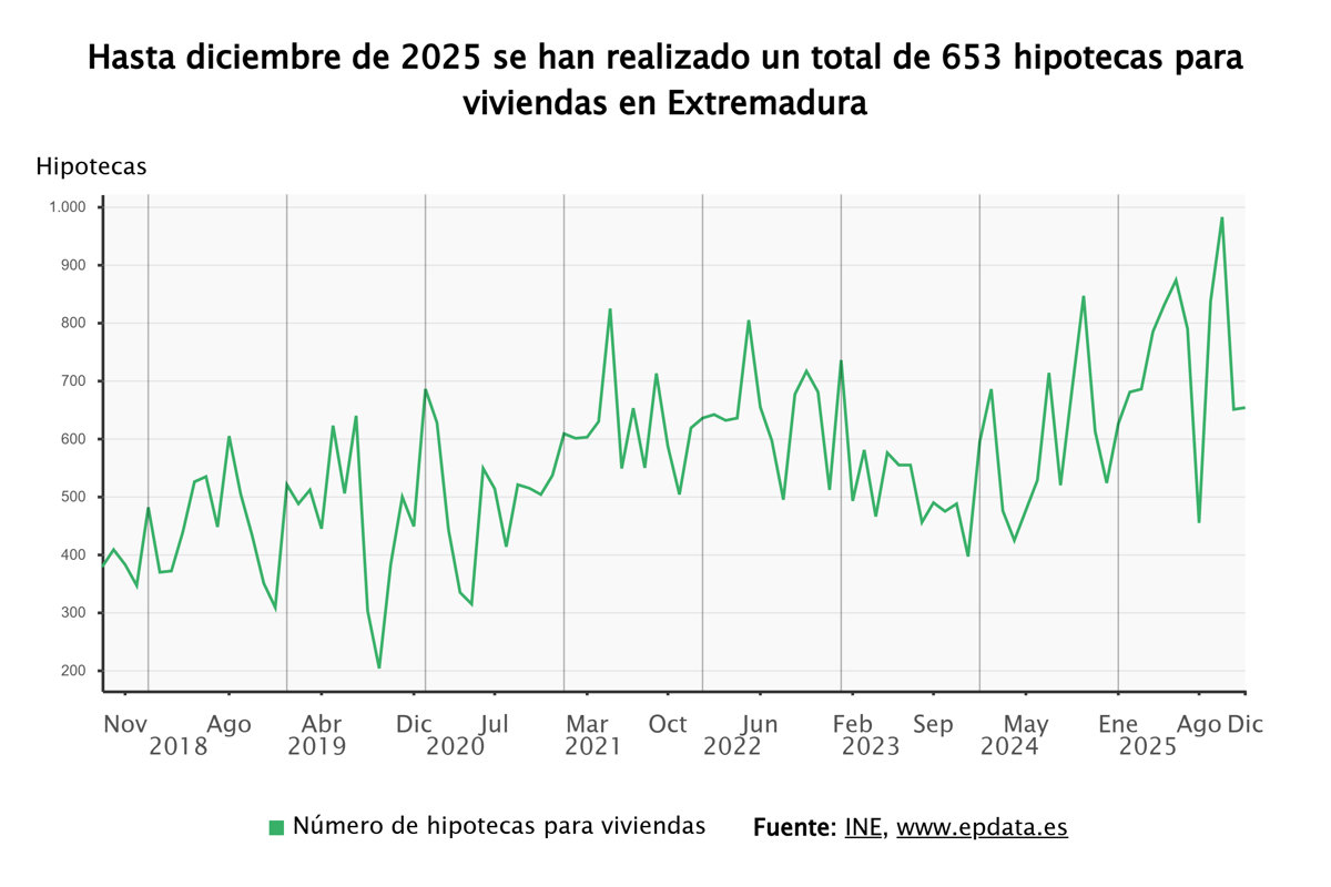El número de hipotecas constituidas sobre viviendas en Extremadura ha aumentado un 24,9% en diciembre respecto al mismo mes del año anterior, frente a una subida del 17,4% a nivel nacional, hasta sumar un total de 653 operaciones y encadena cuatro meses de crecimiento.