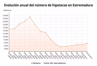 Con respecto a los datos de diciembre de 2019, se han constituido 432 hipotecas en Extremadura, un 16,4% menos que en el mismo mes de 2017 (1,8% en España). El 72% de las hipotecas se han realizado en Badajoz y el 28% en Cáceres.
