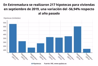El número de hipotecas constituidas sobre viviendas inscritas en los registros de la propiedad de Extremadura se ha situado en 217 el pasado mes de septiembre, cifra un 56,9 por ciento inferior a la del mismo mes de 2018 y la más baja en un mes de septiembre desde 2014, según ha informado este viernes el Instituto Nacional de Estadística (INE).