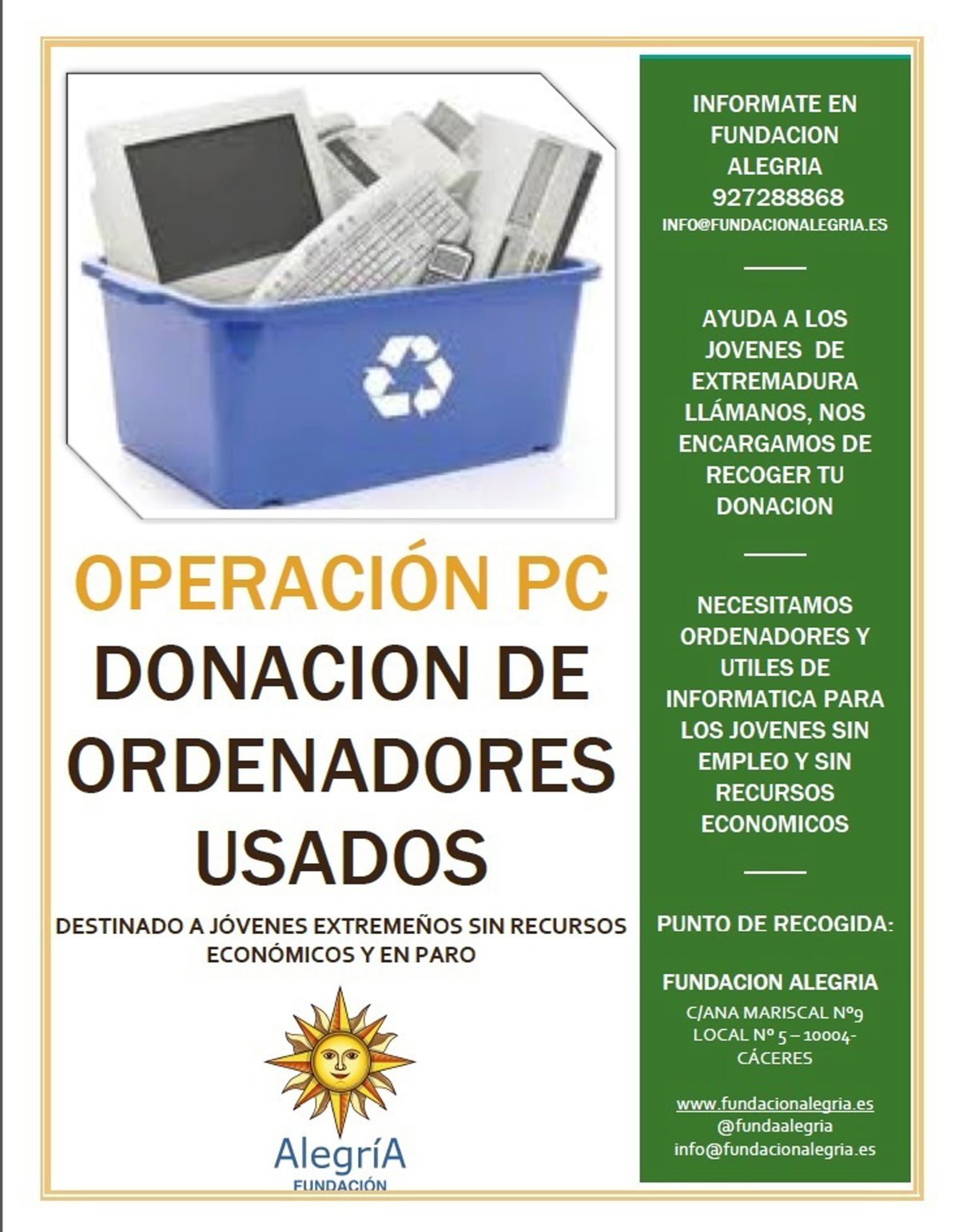 La Fundación Extremeña la Ilusión de la Alegría inicia este lunes, 12 de enero, una nueva edición de la Operación PC, que este año no se limita a la ciudad de Cáceres y amplía su campo de actuación a toda la comunidad autónoma, y que tiene como objetivo la recogida de ordenadores usados.