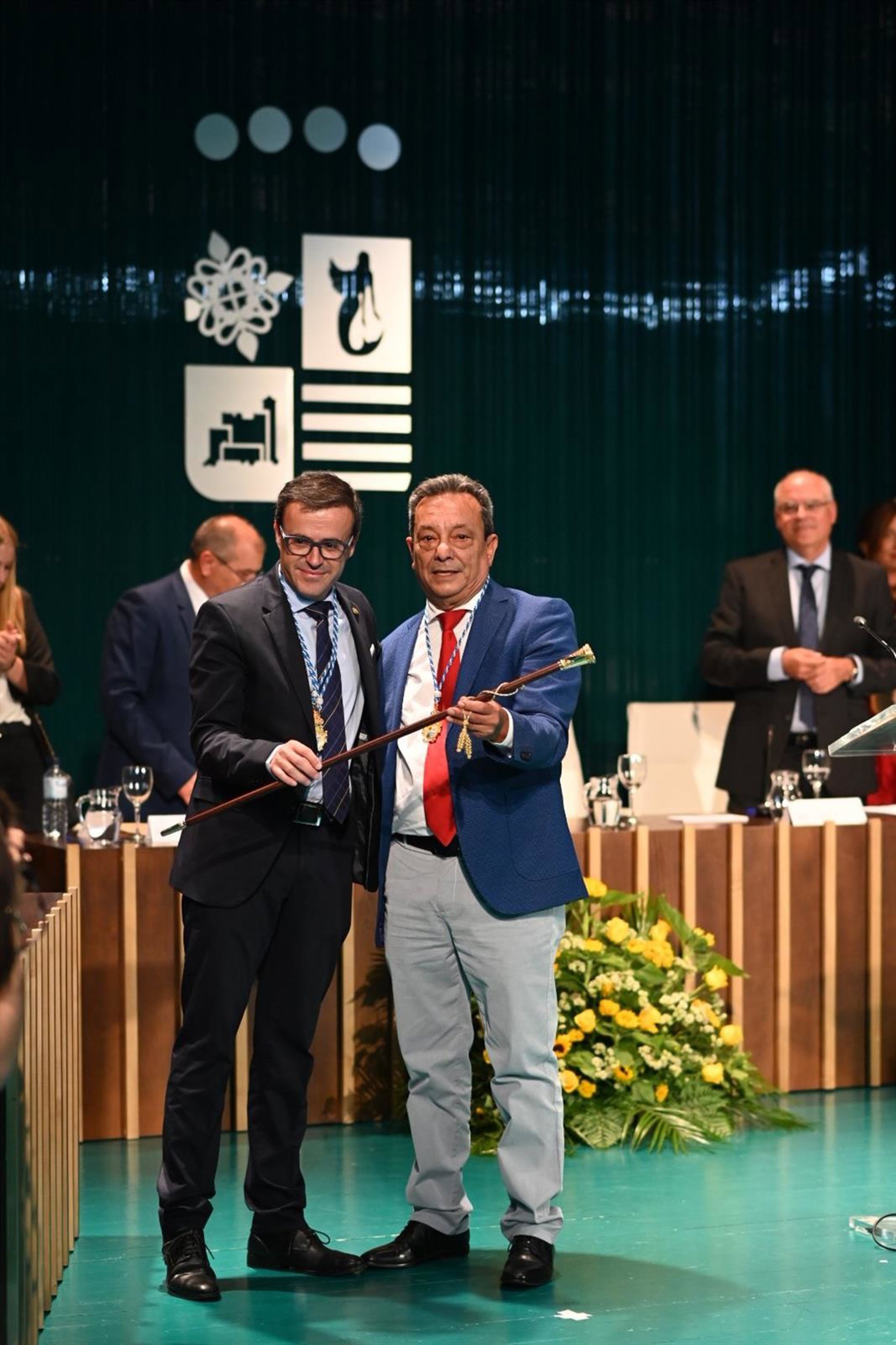 Migual Ángel Gallardo (izquierda), recibe el bastón de mando como alcalde de Villanueva de la Serena. - AYUNTAMIENTO VILLANUEVA DE LA SERENA