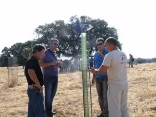 En concreto, a los participantes se les ha enseñado una parcela experimental en la finca de Valdesequera para el estudio diferentes modelos de jaulones protectores que permitan la densificación de la dehesa y el aprovechamiento ganadero.