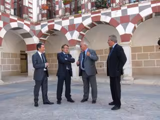 Del Moral ha suscrito este miércoles este convenio de cesión de las viviendas de la Plaza Alta con el responsable y liquidador de la SPA, José Antonio Magdalena, en un acto que también ha contado con la presencia del alcalde de la capital pacense, Miguel Celdrán, quien ha confiado que esta firma permita "seguir en la línea" de "recuperar esta bellísima plaza".