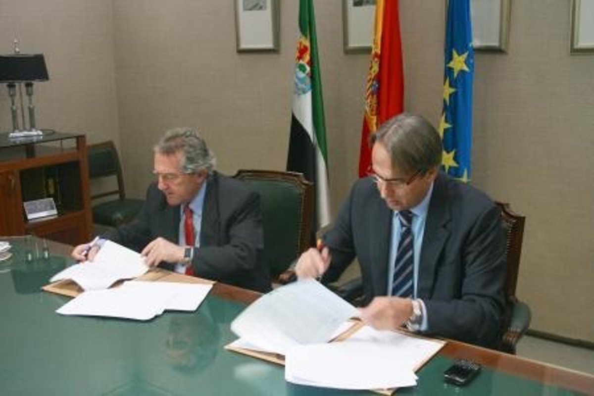 El consejero de Economía y Hacienda, Antonio Fernández, y el director ejecutivo territorial de 'la Caixa' en Extremadura y Castilla La Mancha, Victorino Lluch, han firmado en Mérida un nuevo convenio de colaboración que define la actuación de la obra social en Extremadura.