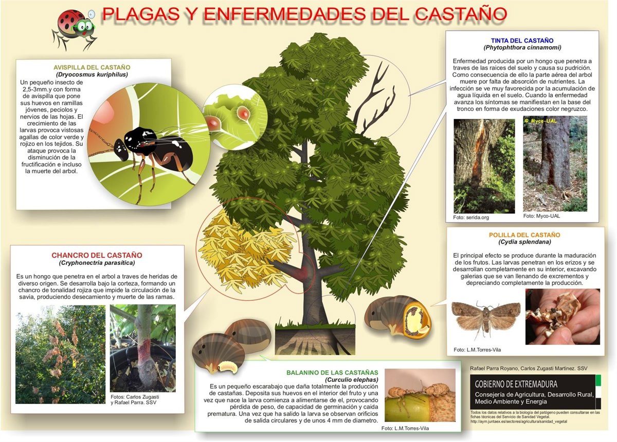 La Dirección General de Agricultura y Ganadería de la Consejería de Agricultura, Desarrollo Rural, Medio Ambiente y Energía de Extremadura ha editado un cartel divulgativo de las plagas y enfermedades del castaño para ofrecer información sobre los principales organismos nocivos que afectan al árbol y al fruto dentro de la comunidad autónoma.