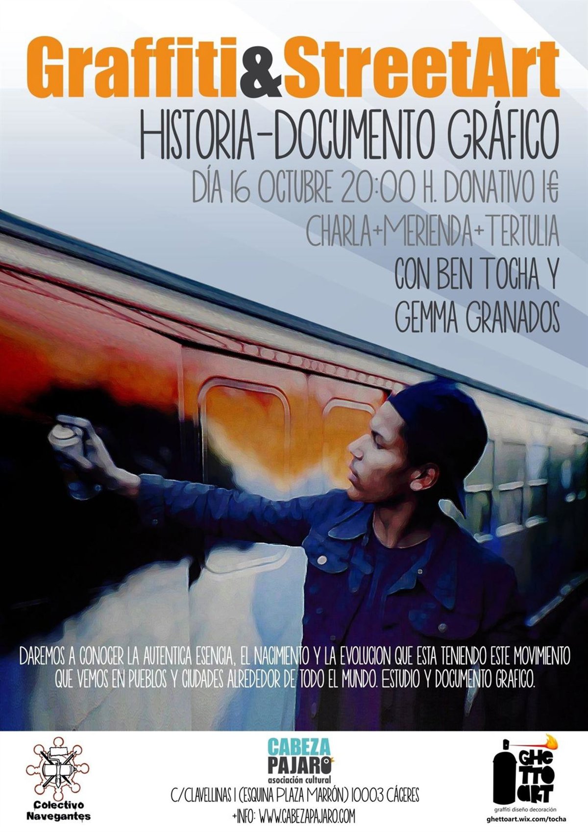 La exposición será inaugurada con motivo de una charla previa, también dedicada a la historia y la evolución del graffiti y el 'street art', en la Sala Cabeza Pájaro. Ben Tocha y Gemma Granados serán algunos de los artistas participantes en el encuentro, abierto a todos los públicos.