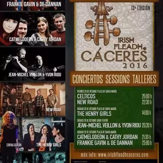 A las 21.30 horas, los conciertos vuelven a Santa María en cuya plaza está prevista la actuación de Catmelodeon & Cathy Jordan, un trío de músicos excepcionales procedente de Sligo que se formó después de años de tocar juntos en sesiones. A Cáceres llegan acompañados de Cathy Jordan, una conocida ya por el público cacereño debido a sus tres visitas anteriores al Irish Fleadh.