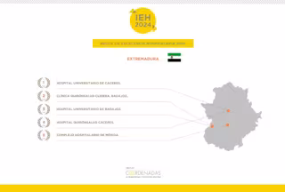 El Hospital Universitario de Cáceres se mantiene en 2024 como principal centro de Extremadura, según el Índice de Excelencia Hospitalaria de este año, que sitúa al Hospital Quirónsalud Clideba Badajoz en segundo lugar, y al Hospital Universitario Badajoz, en el tercer puesto.