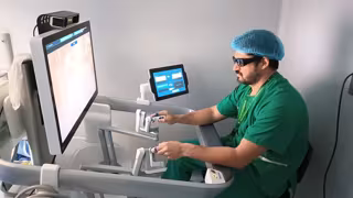 Un cicujano del Hospital Universitario de Cáceres opera el robot quirúrgico HUGO RAS. - JUNTA DE EXTREMADURA