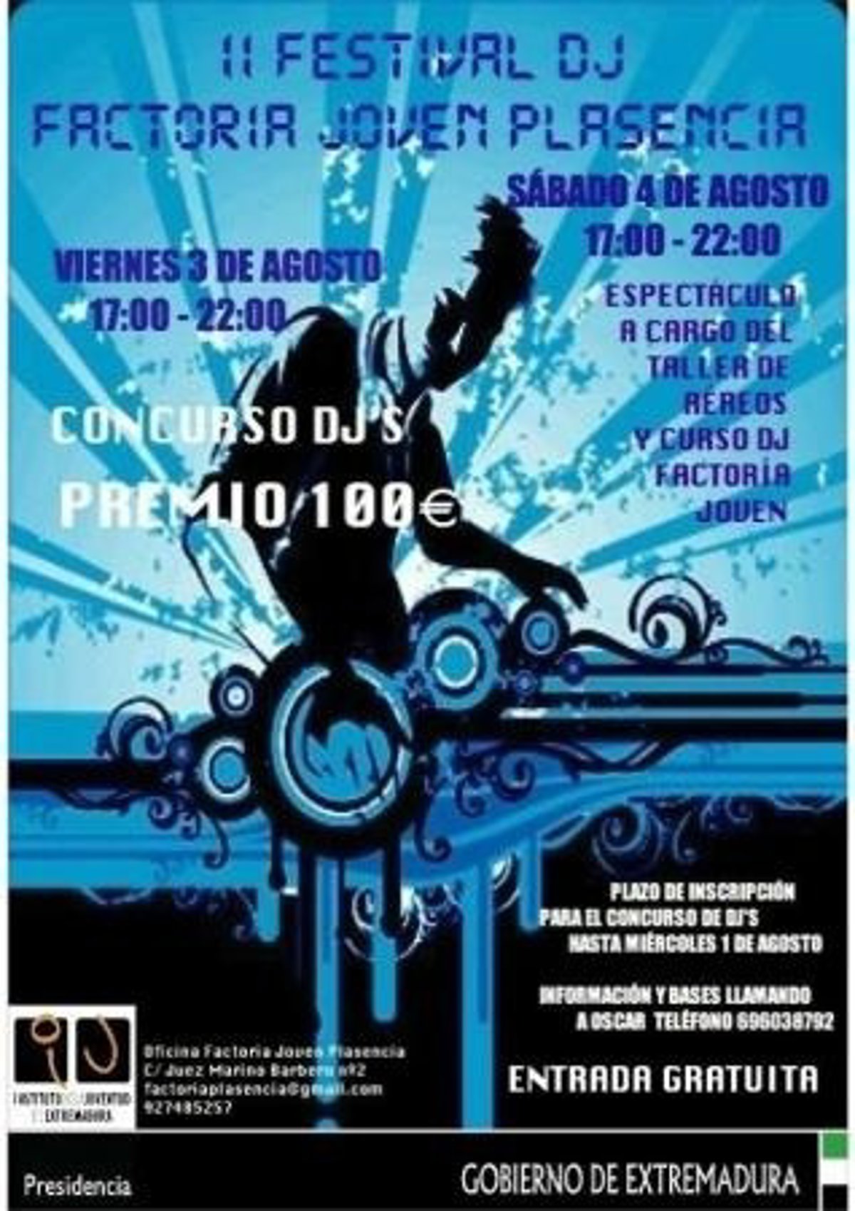 El II Festival DJ que se celebrará los días 3 y 4 de agosto en Plasencia (Cáceres) reunirá una serie de actuaciones, así como un concurso en el que podrán participar un máximo de cinco jóvenes.
