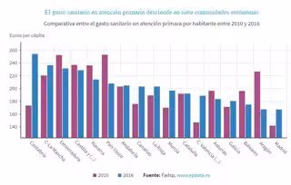 En este sentido, Baleares aparece como la comunidad que peores resultados presenta en todos los parámetros analizados. Como la mayoría de las regiones, entre los años 2010 y 2016 ha disminuido su gasto sanitario total destinado a la AP, situándose en el 12,18 por ciento y en 174,90 euros por habitante.