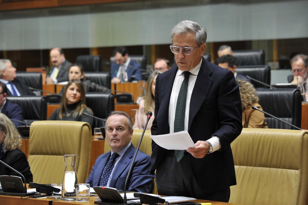 El consejero de Gestión Forestal y Mundo Rural, Francisco Higuero, en la Asamblea en su comparecencia para hablar sobre el regadío de Tierra de Barros - ASAMBLEA DE EXTREMADURA