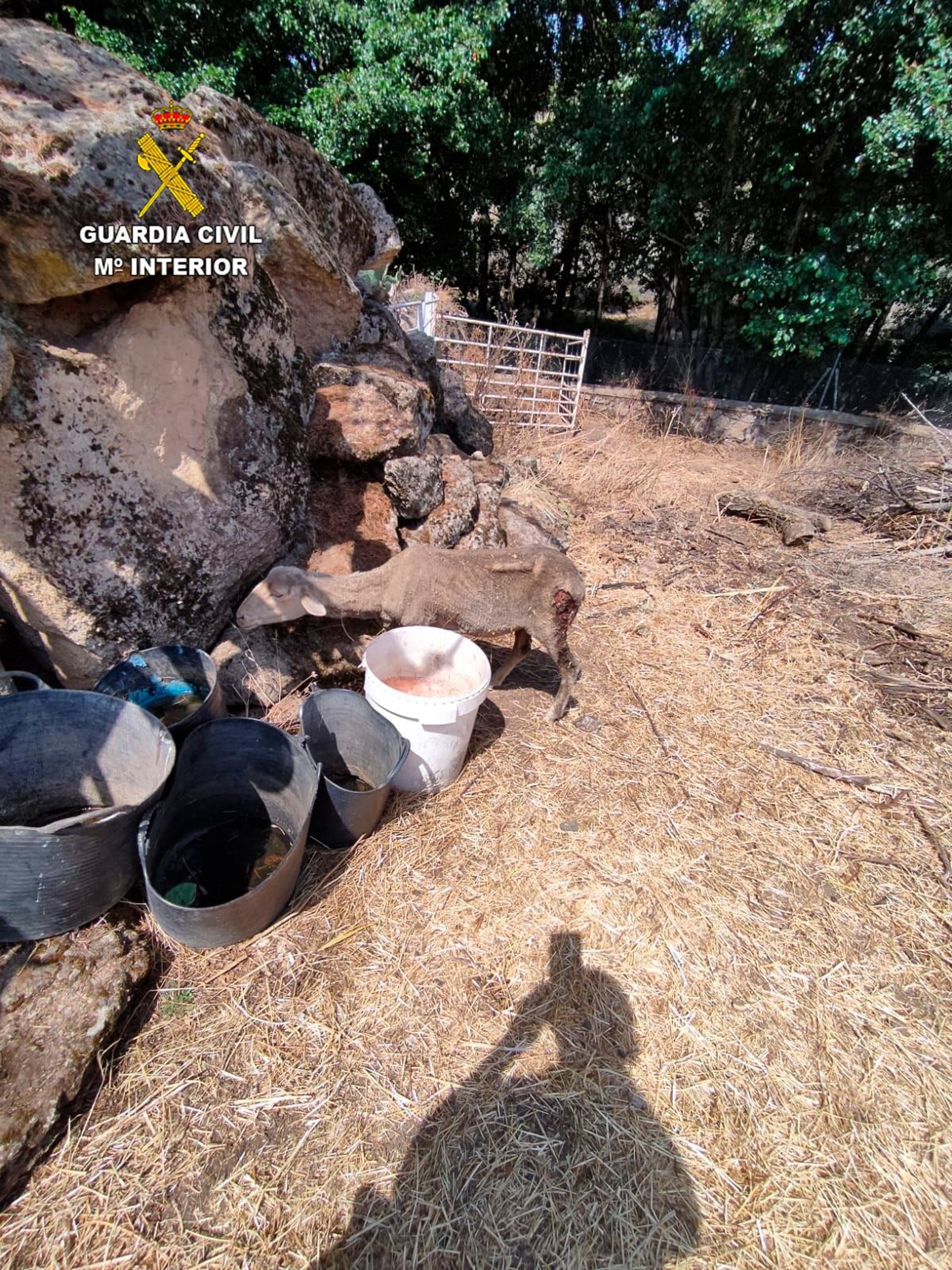 Personados en el lugar, los agentes de la Guardia Civil hallaron tres ovejas muertas y cinco vivas, las cuales presentaban heridas sangrantes en las patas traseras y deshidratación. Además, una de ellas se encontraba en estado crítico y, como primera medida, los agentes buscaron un recipiente donde el animal pudiera abrevar y calmar su sed.