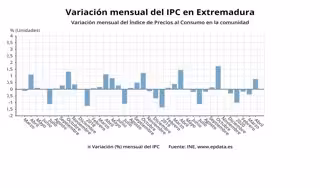 Gráfico de la evolución mensual del IPC en Extremadura en abril de 2020 - EPDATA