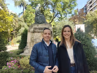 El candidato de Vox a la Presidencia de la Junta de Extremadura, Óscar Fernández, y la portavoz nacional de Vox de la Agenda España, Isabel Pérez Moñino, en el Paseo de Cánovas en Cáceres - EUROPA PRESS