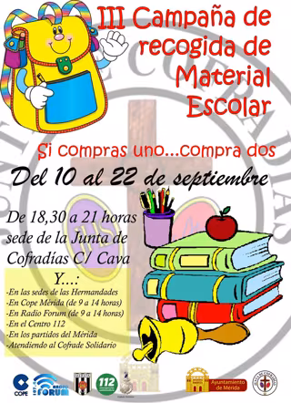 De esta manera, y junto a la Cadena COPE, Radio Forum, 112 de Extremadura, Mérida A.D. y el Cofrade Solidario, se ponen manos a la obra para intentar sensibilizar a los vecinos de Mérida y poder recaudar el material que necesitan "muchos niños y niñas de la ciudad".