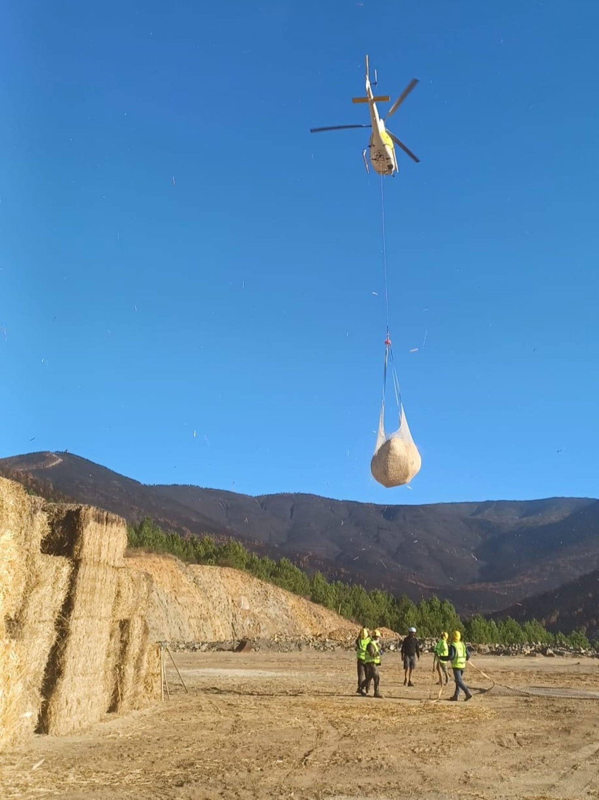Los primeros trabajos son de 'helimulching', que permitirá colocar en lugares estratégicos de los montes afectados entre 50.000 y 80.000 kilos de paja cada día, según el lugar.