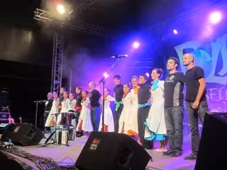 Han abierto la noche los vascos Korrontzi & Oinkari y su puesta en escena, con un grupo joven de dantzaris ataviados con los trajes tradicionales que disfrutaban sobre el escenario y transmitían su entusiasmo al público.