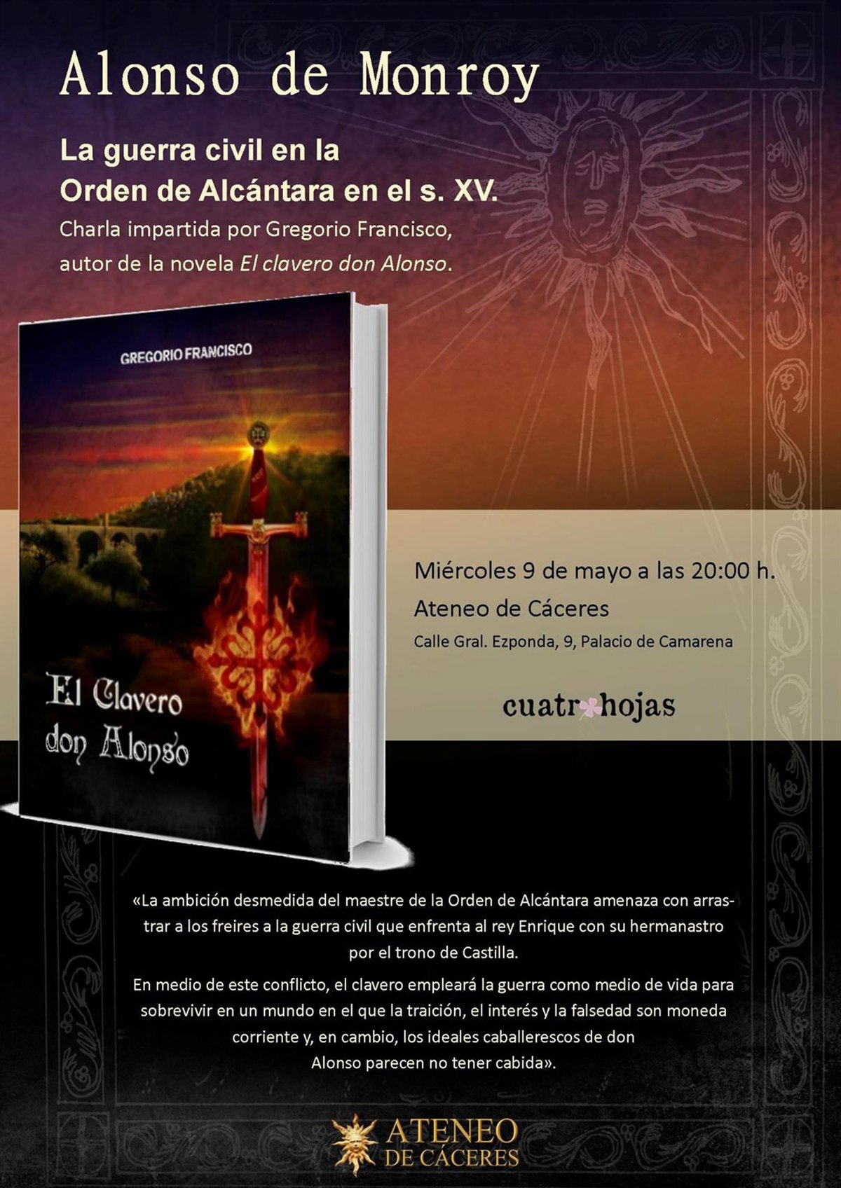 "La ambición desmedida del cabeza de la Orden de Alcántara amenaza con arrastrar a todos los freires hacia la guerra civil que enfrenta al rey con su hermanastro por el trono de Castilla. En medio de este conflicto, el clavero empleará la guerra como medio de vida para intentar sobrevivir en un mundo en el que la traición, el interés y la falsedad son moneda corriente y, en cambio, los ideales caballerescos de don Alonso parecen no tener cabida", señala en nota de prensa el Ateneo de Cáceres.