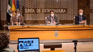 El consejero de Sanidad, José María Vergeles, en rueda de prensa para informar sobre situación de las listas de espera sanitarias en la región, acompañado de otros responsables autonómicos de dicha temática - JUNTA DE EXTREMADURA