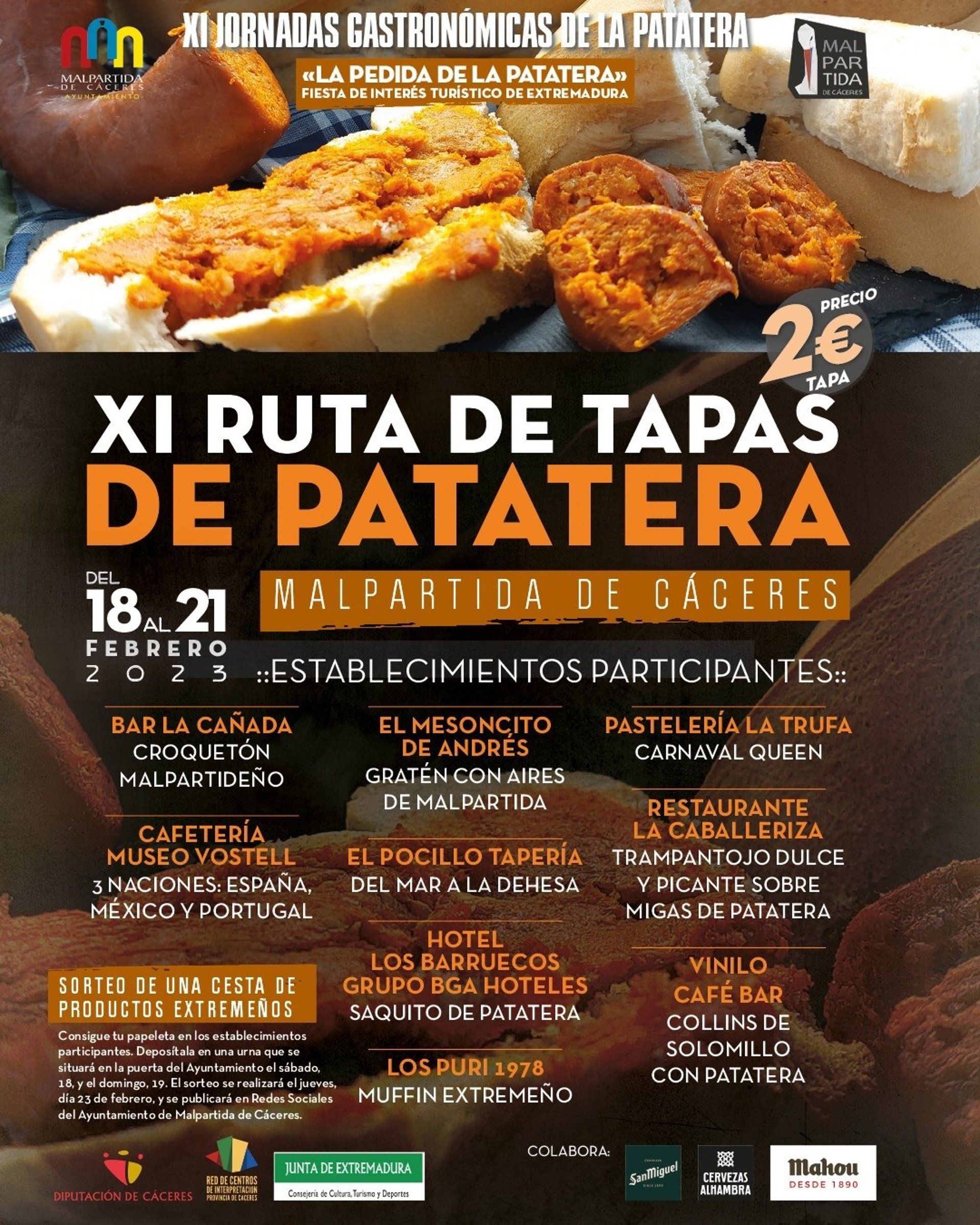 Además, el día 18, y hasta el día 21, se celebrará la XI Ruta de la Tapa de Patatera, con la participación de nueve establecimientos malpartideños que han elaborado deliciosas propuestas con el embutido estrella que podrán adquirirse por dos euros. Además, con cada consumición se conseguirán papeletas para el sorteo de una gran cesta de productos extremeños, informa en nota de prensa el Ayuntamiento de Malpartida de Cáceres.