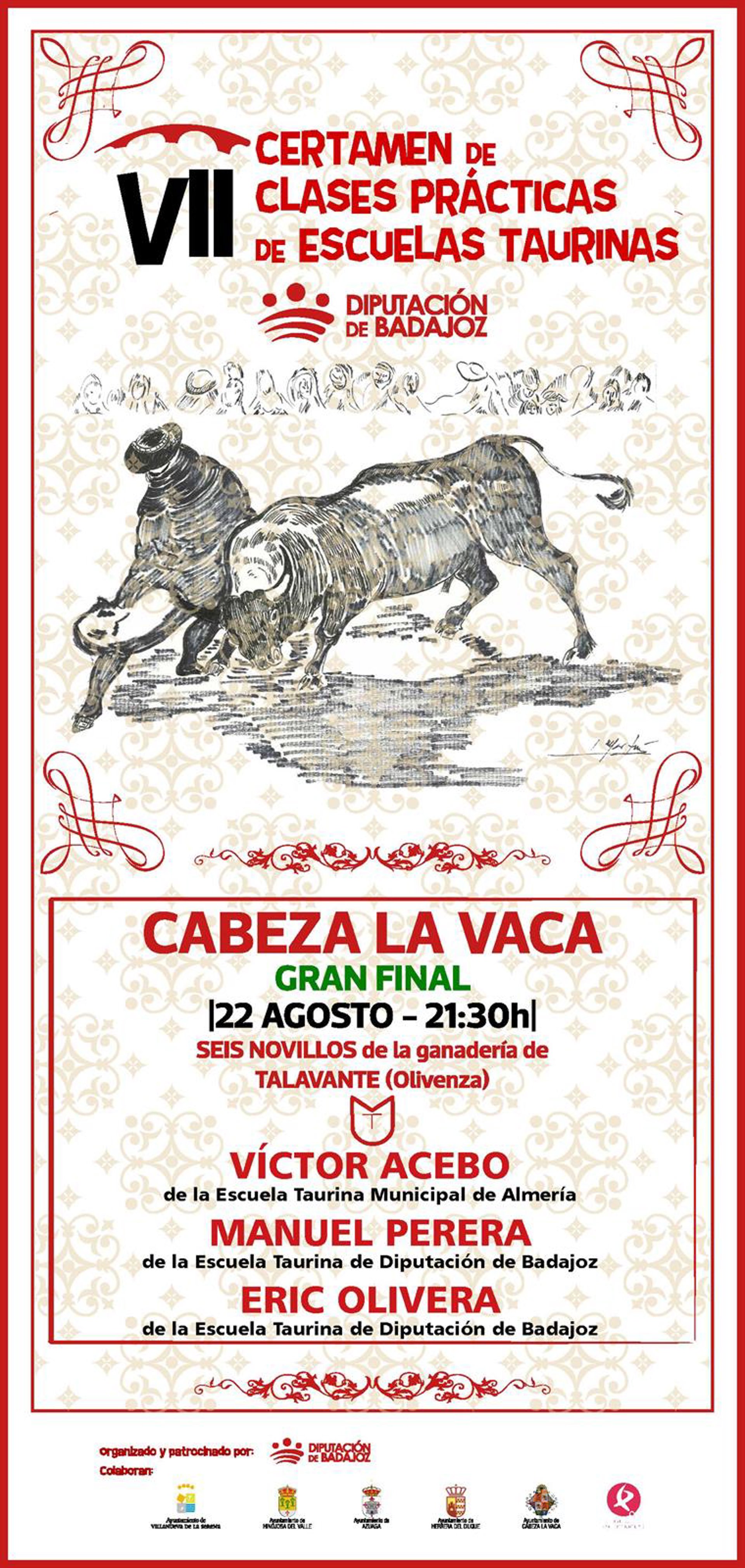 El cartel, por tanto, queda compuesto por erales de toros de Talavante para los novilleros Víctor Acebo (ET de Almería), y Manuel Perera y Eric Olivera, ambos de la Escuela Taurina de Badajoz.