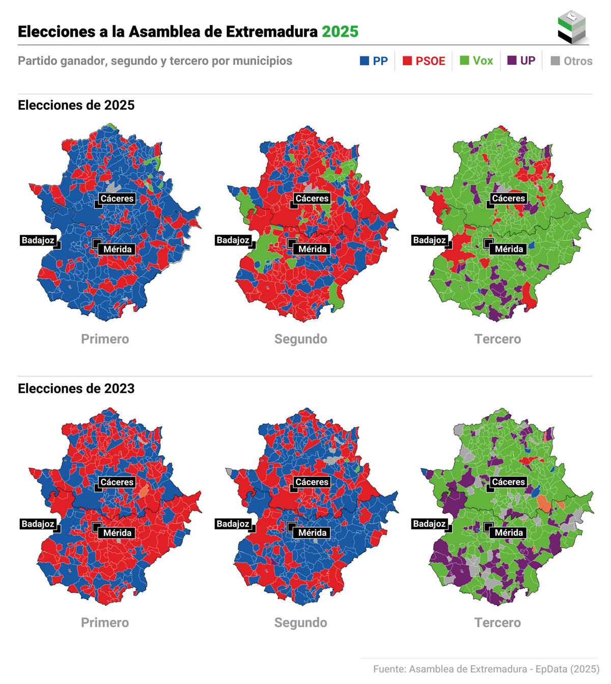 El PSOE ha quedado en segunda posición con 30,6 puntos, por delante de Vox (18,9 por ciento) y Unidas por Extremadura (8,6 por ciento). En las elecciones autonómicas del año 2023, los socialistas fueron los más votados con el 50,1 de los votos, por lo que la formación de Gallardo ha perdido casi veinte puntos en dos años.