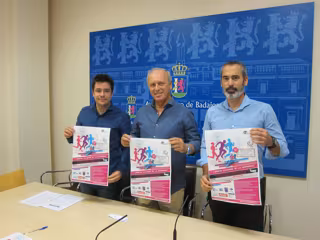 El concejal de Deportes del Ayuntamiento de Badajoz, Miguel Ángel Rodríguez de la Calle, y los representantes del Centro Fenómeno, Ismael Rodríguez, y de la Fundación Primera Fila, Felipe Ferrin, han presentado esta prueba que también conmemora el Día de la Hispanidad.