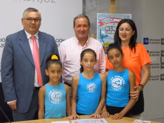 El diputado de Cultura de la institución provincial pacense, Miguel Ruiz; el alcalde de Alconchel, Óscar Díaz; y la medallista olímpica pacense y entrenadora del Club Gimnasia de Badajoz, Nuria Cabanillas, han presentado esta iniciativa que este año duplica el número de participantes, entre los que se cuentan desde gimnastas que se inician en la materia a campeonas nacionales.