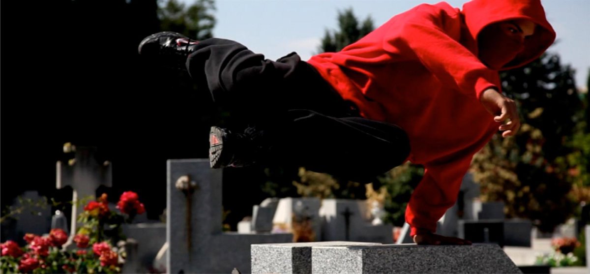 La videoinstalación muestra el recorrido que un grupo de traceurs hace por el Cementerio Civil de la Necrópolis del Este de Madrid a propuesta de Democracia, que ha ideado el proyecto como una suerte de monumento negativo de carácter efímero, informa AC/E.