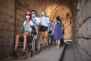 Archivo - Un hombre en silla de ruedas visita un monumento de Mérida. - AYUNTAMIENTO DE MÉRIDA - Archivo