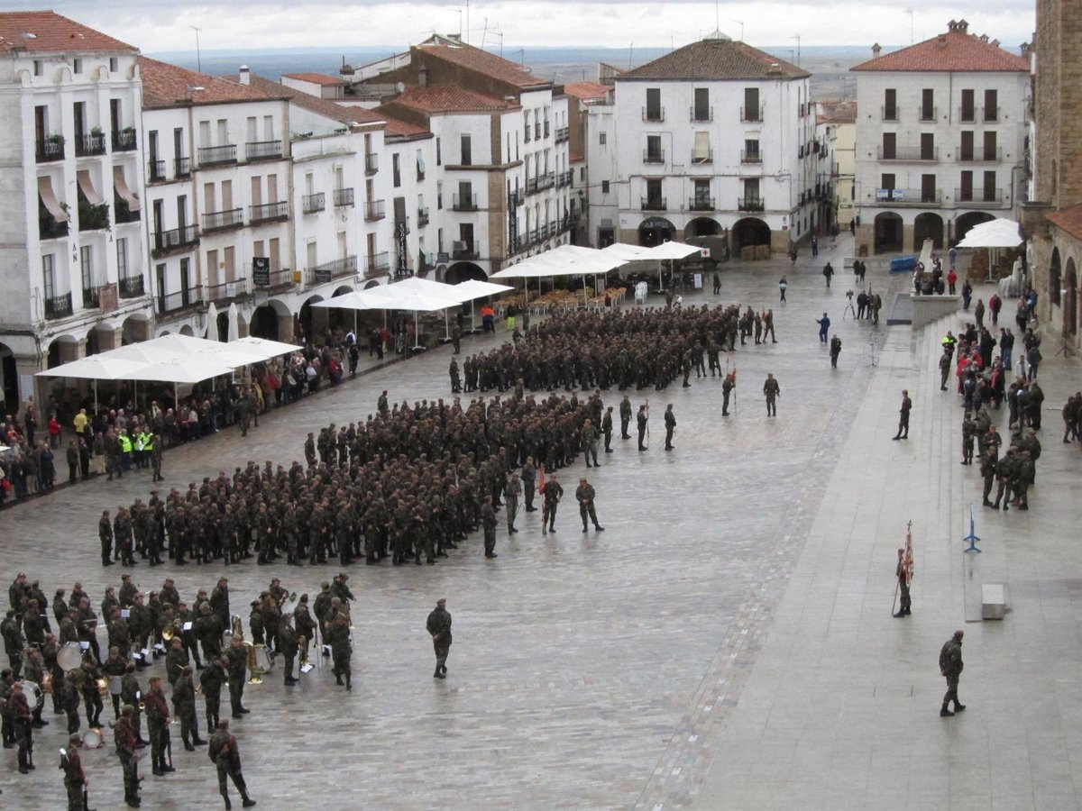 Los 450 militares que participarán en la Jura de Bandera este sábado, día 5, en la Plaza Mayor de Cáceres han realizado este viernes un ensayo general que ha sido seguido por decenas de curiosos que no se han querido perder los preámbulos del evento en el que se espera la asistencia de unas 5.000 personas.