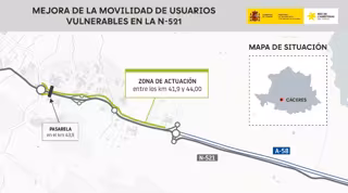 El Ministerio de Transportes y Movilidad Sostenible ha aprobado el expediente de información pública y definitivamente el proyecto de trazado para la construcción de una vía ciclista y una pasarela en la carretera N-521, entre los kilómetros 41,900 y 44, en el término municipal del Cáceres, con un presupuesto de obra estimado de 2,8 millones de euros (IVA incluido).